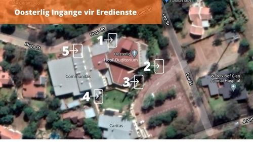 7. Gebruik Ingange 1, 2 & 3 - vir persone wat die Erediens in die Hoofouditorium bywoon